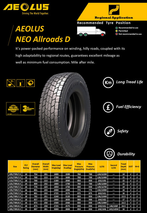 DESCRIPCIÓN El NEO Allroads S es un neumático de dirección, adecuado para aplicaciones regionales, con mayor capacidad de carga (siguiendo el Regla...