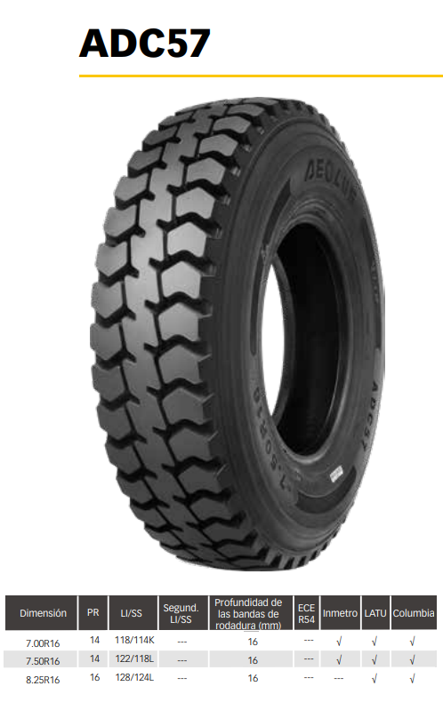 DESCRIPCIÓN La ADC53 es una agresiva llanta radial, diseñada para ser usada en servicio dentro y fuera de carretera en condiciones severas. El dise...