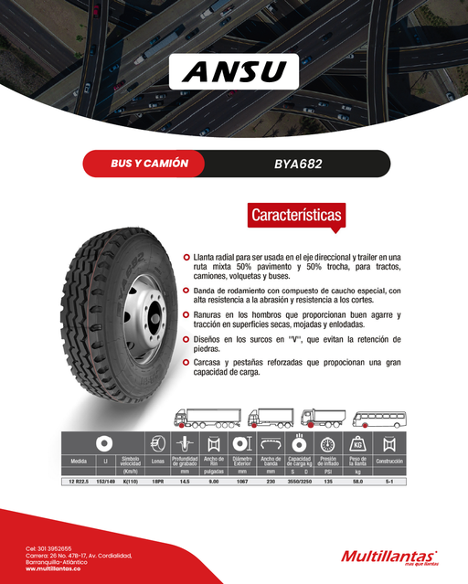 Llanta 12R22.5 18Pr 152/149K Bya682 Mix OTR Ansu