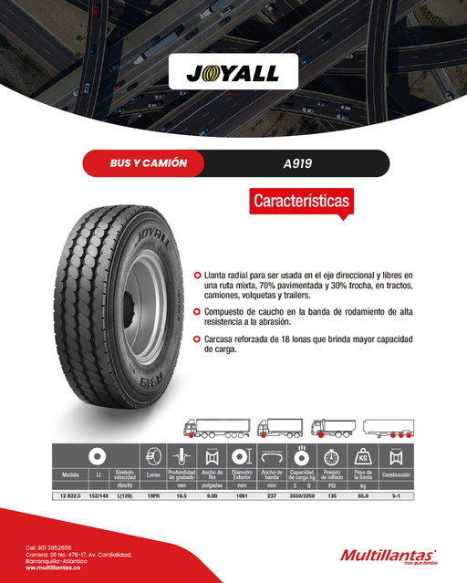 Llanta radial para ser usada en los ejes de tracción en una ruta mixta 70% pavimentada y 30% trocha, en tractos, camiones, volquetas y buses. Comp...