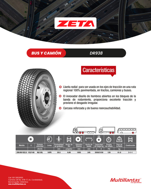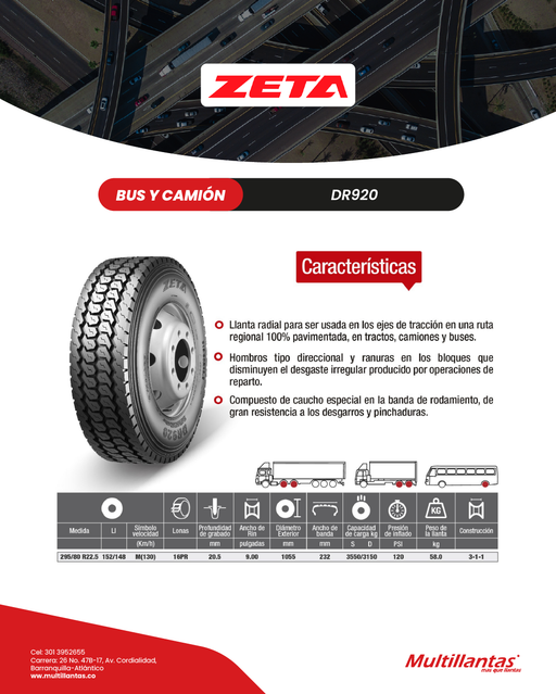 Llanta radial para ser usada en los ejes de tracción en una ruta regional 100% pavimentada, en tractos, camiones y buses. Hombros tipo direccional...