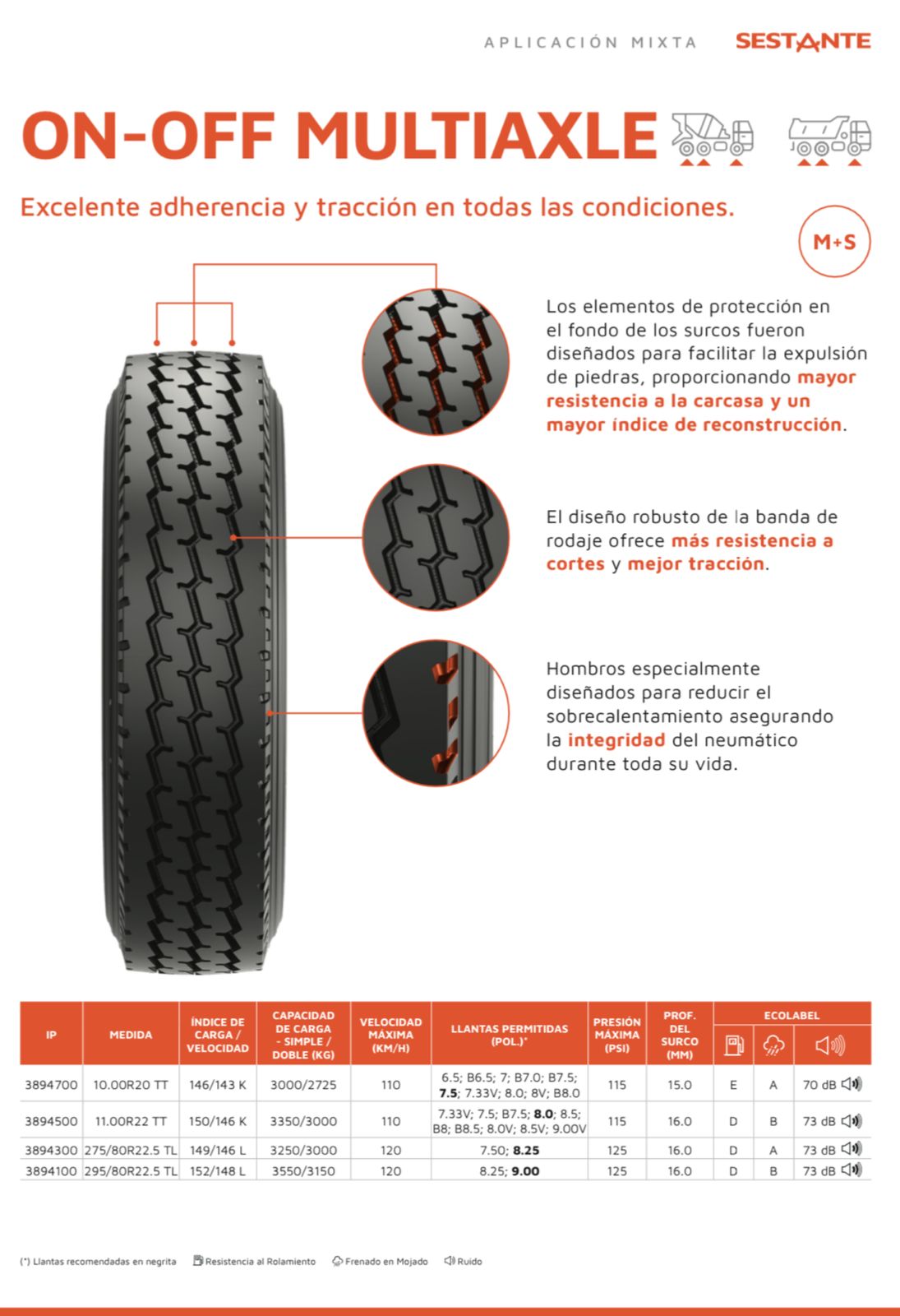 Especificaciones clave que incluyen el ancho, el perfil, la construcción y el diámetro del rin.