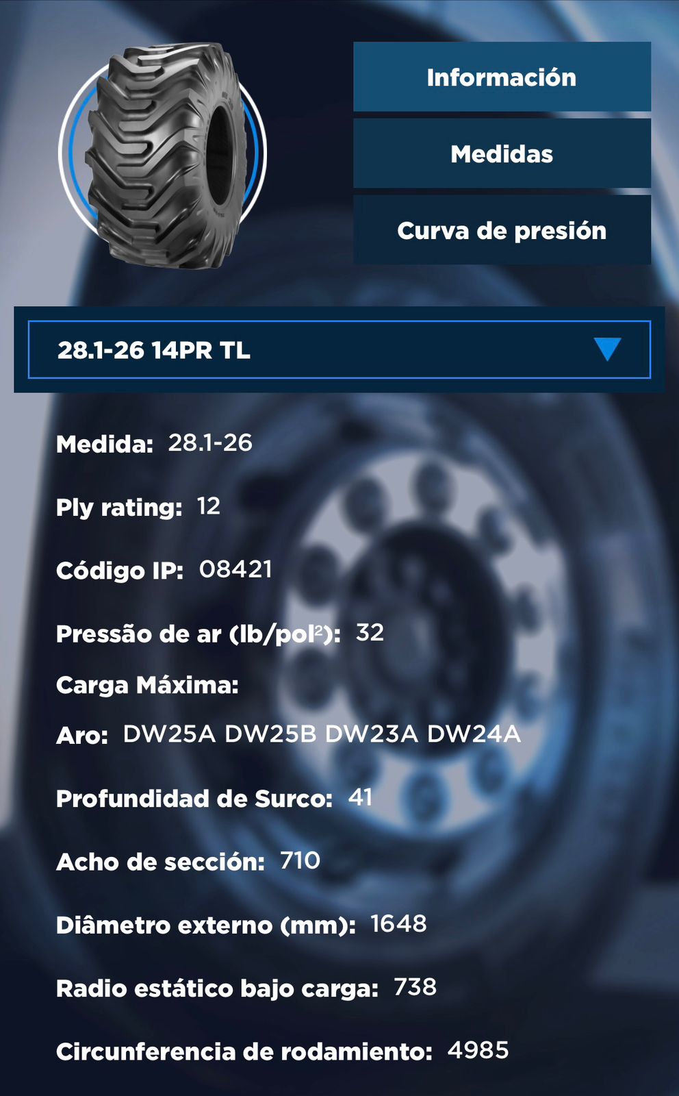 Especificaciones clave que incluyen el ancho, el perfil, la construcción y el diámetro del rin.