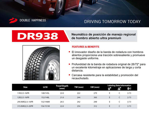 DESCRIPCIÓN Es un neumático radial sin cámara para vehículos de carga pesada, ideal para ejes de tracción. Soporta hasta 3550 kg, con velocidad máx...