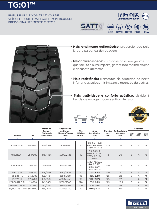 Conducir con neumáticos de eje con estructura innovadora, compuestos y diseño de banda de rodamiento para proporcionar resistencia a laceraciones en off-road y el kilometraje y el confort acústico en las carreteras asfaltadas.