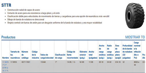 DESCRIPCIÓNEs una llanta radial de uso intensivo, diseñada especialmente para aplicaciones de movimiento de tierras (E3) y cargadores (L3). Su cons...
