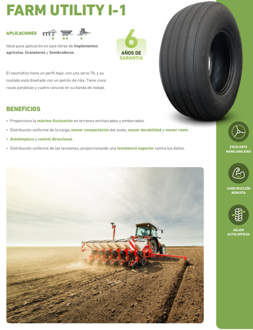 DESCRIPCIÓN Es un neumático agrícola diseñado para implementos y maquinaria de uso en terrenos agrícolas. Características Tracción eficiente: E...