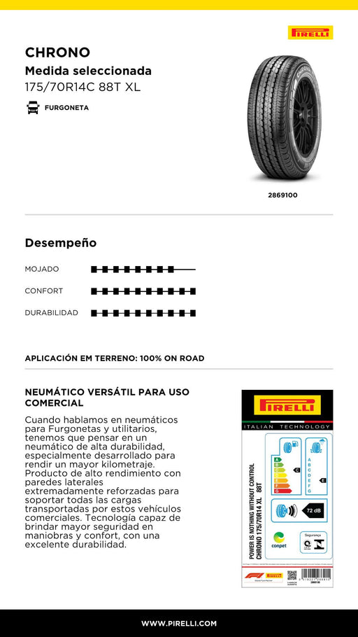 Ver todos los detallesCHRONO Medida seleccionada175/70R14C 88T XL 🚐 Furgoneta Aplicación en terreno: 100% On Road NEUMÁTICO VERSÁTIL PARA USO COMERCIAL Cuando hablamos d...